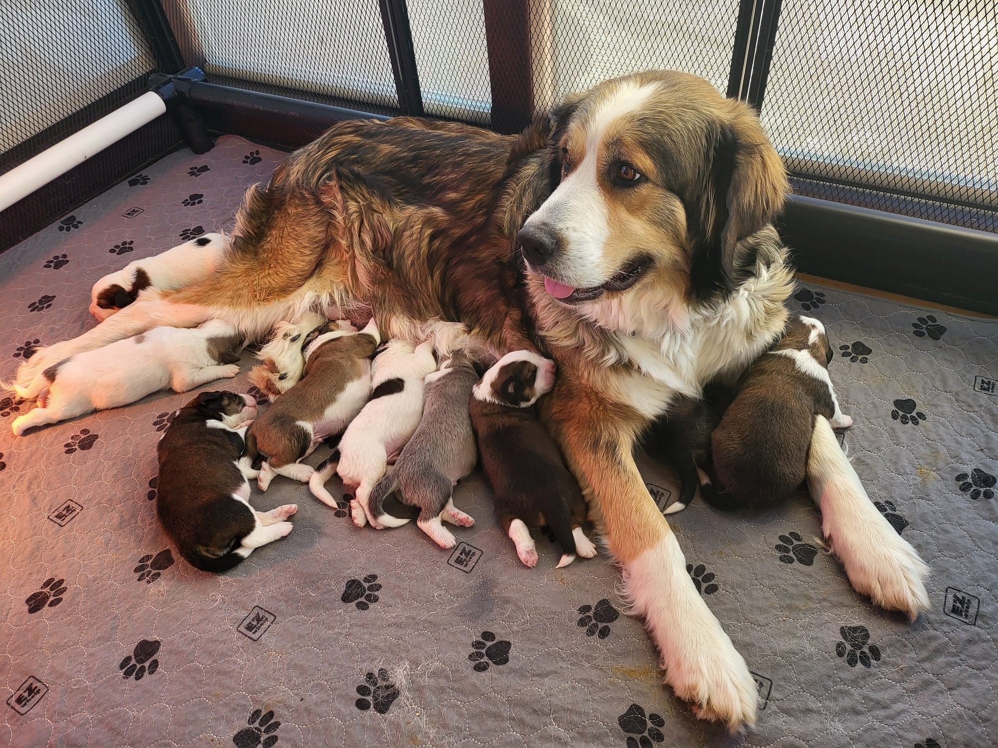 Gertie is such an awesome mother. She is also such a sweetheart. She loves company and attention. She weighs in around 110 lbs, with the color that is giving us such a nice variety of colors in the puppies that these two are producing. She was brought in from breeders in Indiana.